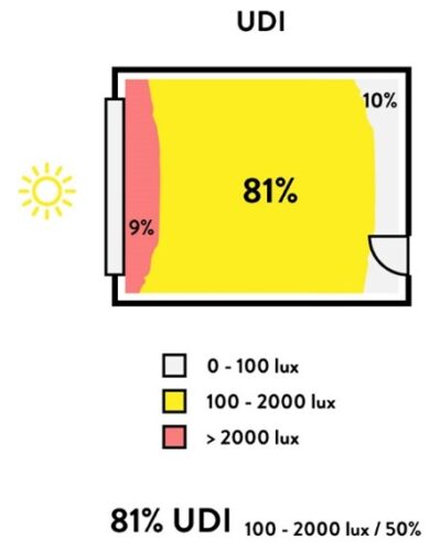 بر اساس این تقسیمبندی، روشنایی طبیعی بین محدوده 100 تا 2000 لوکس محدوده “مفید” برای فضا محسوب میشود. شاخص UDI کیفیت روشنایی یک فضا را تعریف میکند که در آن فضا نه تاریک است و نه خیلی روشن و خیره کننده. به همین دلیل این شاخص در بسیاری از مقالات مورد استفاده قرار گرفته است و به این صورت تعریف میشود: درصدی از اوقات سال (در هنگام روز) که میزان روشنایی فضا در بازه مفید و قابل قبول 100 تا 2000 لوکس باشد. توصیه میشود که حداقل 80% مساحت فضا نور طبیعی در این محدوده را دریافت نماید. شکل 1مثالی از شبیهسازی یک اتاق است که 81% از مساحت آن به مدت حداقل 50% از زمان اشغال فضا در طول سال، نور “مفید” دریافت میکند. بر اساس شاخص UDI این اتاق در طول سال نور کافی دریافت میکند. مطالعات بیشتر در مورد اینکه کدام نواحی اتاق روشنایی بیش از حد و یا بسیار کم دریافت میکنند میتواند انجام شود.