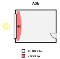 شاخص ASE یکی دیگر از شاخصهای پویای نور روز است و درصدی از مساحت نما را محاسبه میکند که دریافت نور بسیار زیادی دارد. در واقع ASE با ایجاد یک آستانه بالا برای دریافت سطحی از نور روز مفید در ساختمان، شاخص sDA را تکمیل میکند زیرا همانطور که توضیح داده شد، شاخص sDA سطح روشنایی 300 لوکس به بالا (مینیمم سطح روشنایی مورد نیاز) را اندازه میگیرد و بنابراین ممکن است فضا روشنایی بیش از حد دریافت کند و خطر ایجاد خیرگی و پدیده گرمای بیش از حد روی دهد. شاخص ASE نشان دهنده درصدی از مساحت فضا است که بیش از 1000 لوکس تابش مستقیم در بیش از 250 ساعت از سال (در مواقع اشغال فضا) دریافت میکند. با این شاخص میتوان میزان ریسک نفوذ بیش از حد تابش مستقیم و وقوع خطر خیرگی را بررسی نمود. برای طراحی یک فضای کارآمد به لحاظ مباحث روشنایی، دستیابی به مقادیر sDA بالا و ASE پایین، میتواند ضامن دریافت مقادیر مناسبی نور روز مفید و در نتیجه کاهش همزمان میزان استفاده از نور مصنوعی و سیستم تهویه مطبوع باشد. بر اساس LEED v4 ، مقدار ASE باید کمتر از 10% باشد و به این معنی است که کمتر از 10% از مساحت فضا مجاز به دریافت تابش مستقیمی بیش از 1000 لوکس، در بیش از 250 ساعت از اوقات اشغال فضا، میباشد. برای دریافت نشان LEED v4 نیاز است که همزمان sDA بیشتر از 55% و ASE کمتر از 10% باشد.