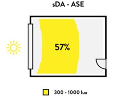 با توجه به اینکه شاخصهای sDA و ASE باید با هم مورد استفاده قرار گیرند، و از سوی دیگر sDA نشان دهنده حد پایین و ASE نشان دهنده حد بالای روشنایی است، بنابراین در این اتاق اگر مقدار ASE را از مقدار sDA کم کنیم درصدی از مساحت اتاق به دست میآید که نور روز کافی و مفید دریافت میکند. این تصویر، محدوده دریافت نور کافی و مفید را در اتاق نشان میدهد.